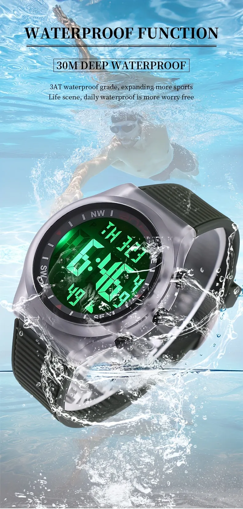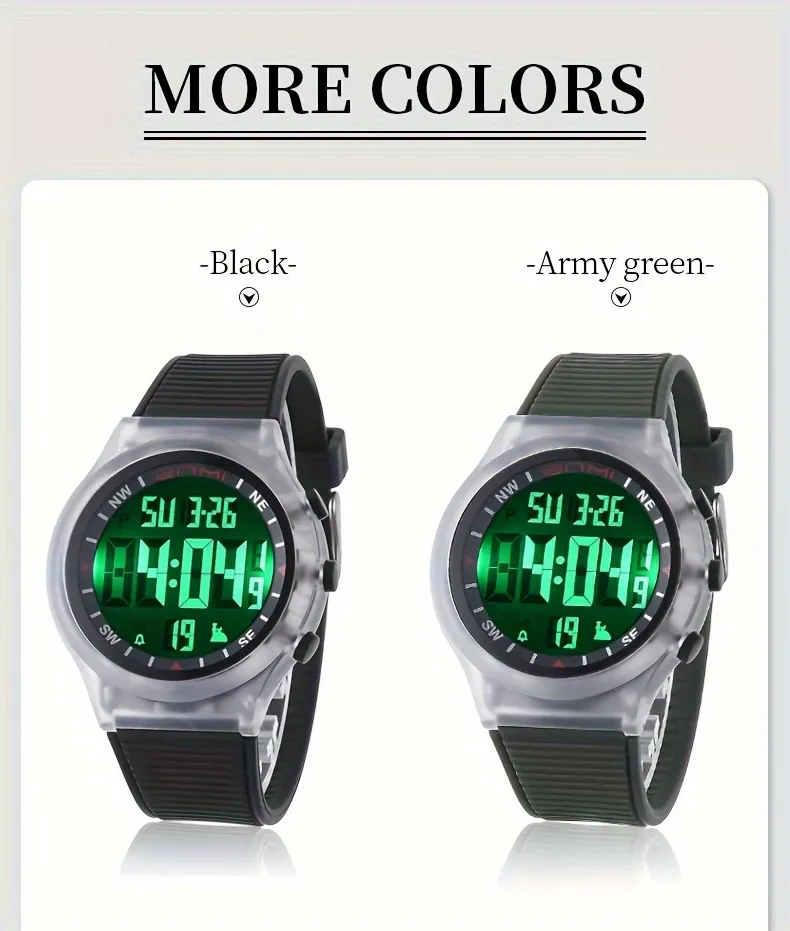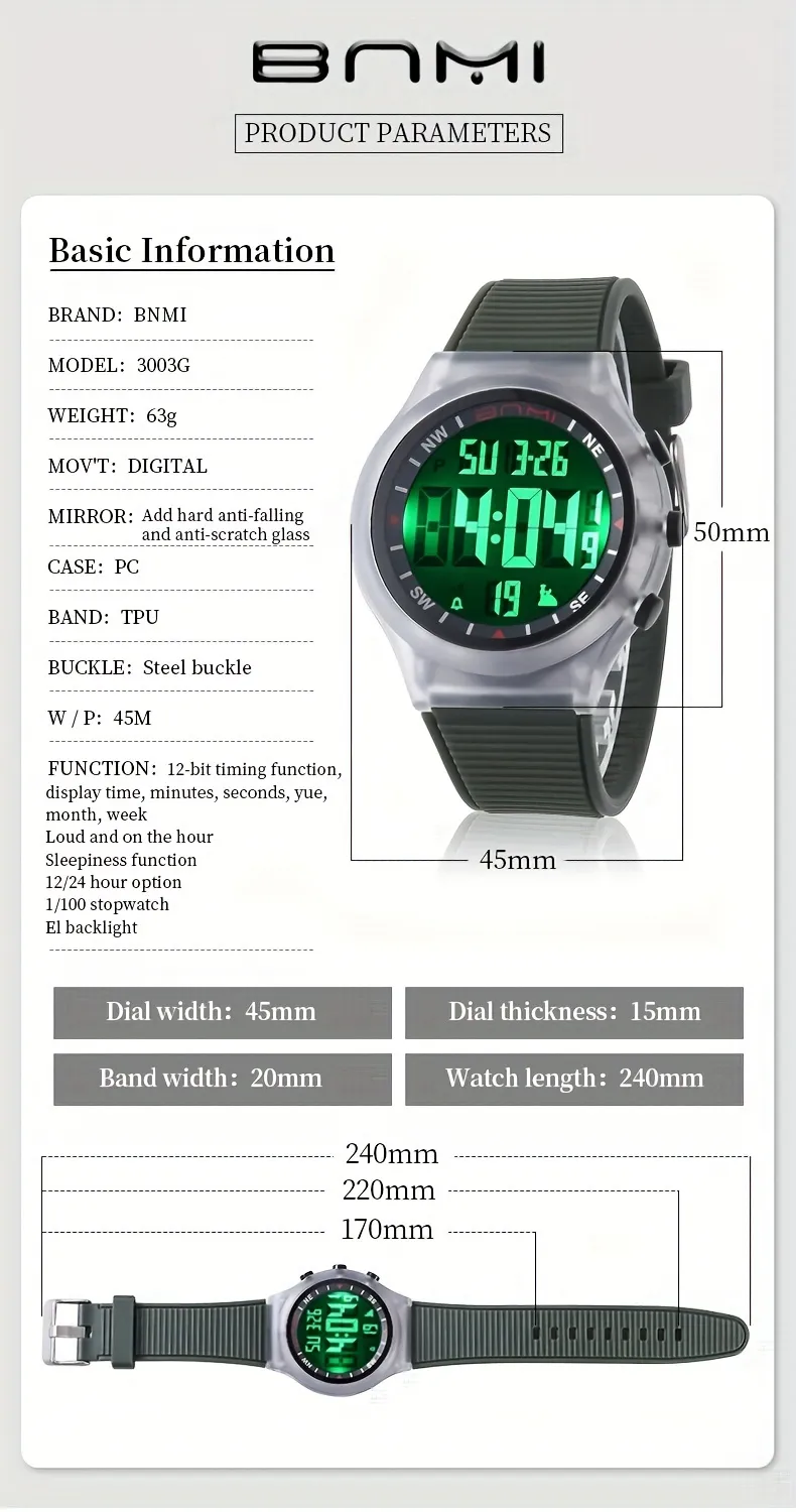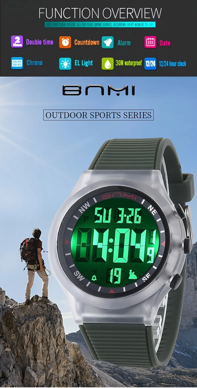 Product details of BNMI EL Light Sports Electronic Watch For Outdoor, 1181.1inch WR Digital Alarm Wrist Watch For Men Women Sports